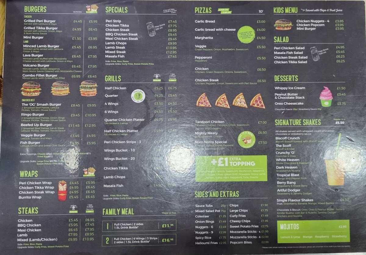 Welcome to Nom Noms, a delightful culinary gem located at 430 Wilbraham Rd, Chorlton-cum-Hardy, Manchester. Known for its vibrant menu, Nom Noms brings a mouthwatering selection of burgers and pizzas that tantalize taste buds. Indulge in a variety of burgers such as the Fillet 'O' Fire and the sensational Peri Burger, praised by customers for their stunning flavors and impeccable seasoning.